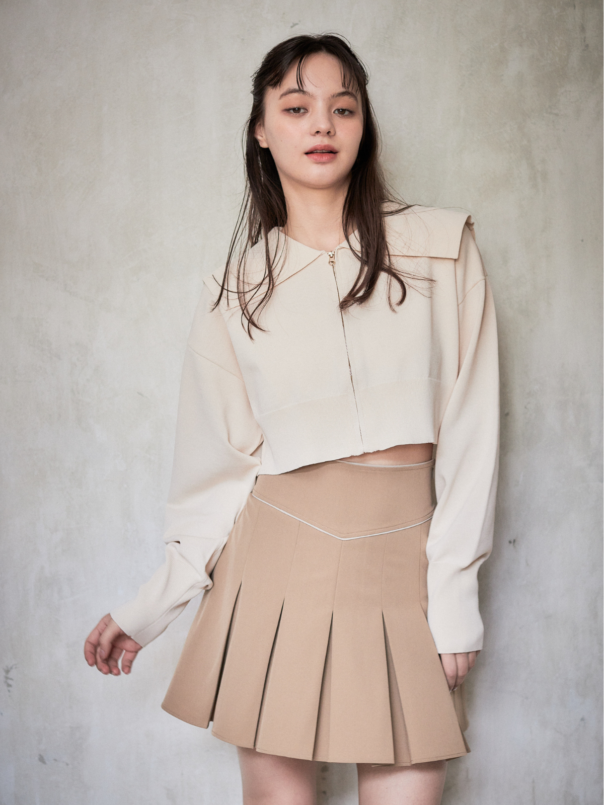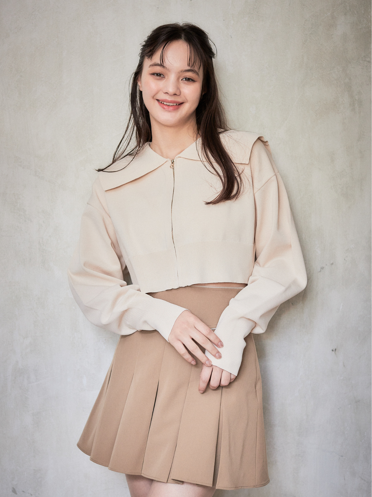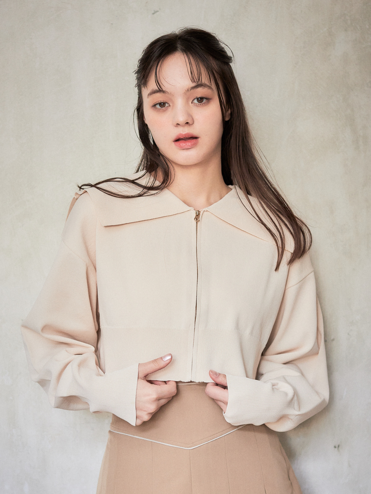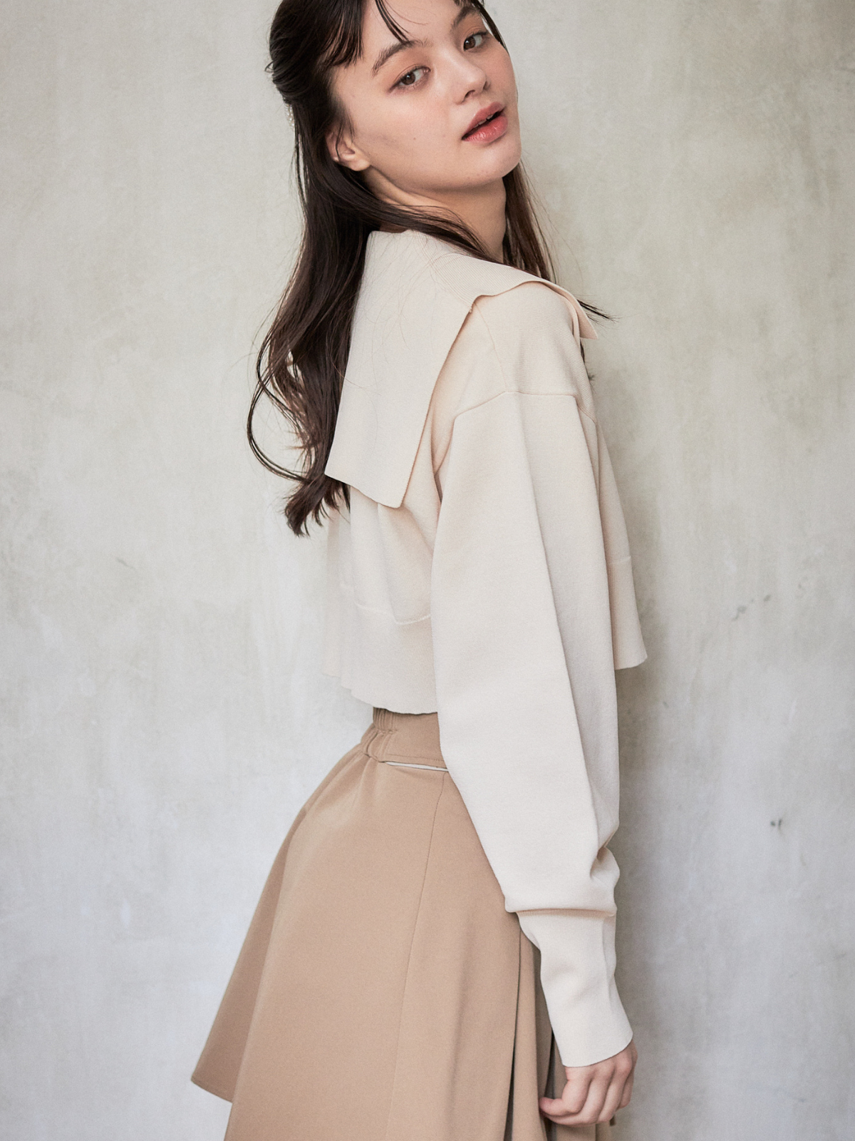 セーラーカラーが目をひくニットカーディガン。