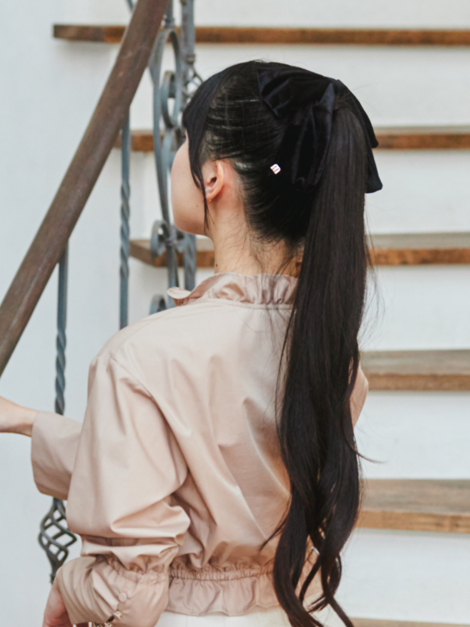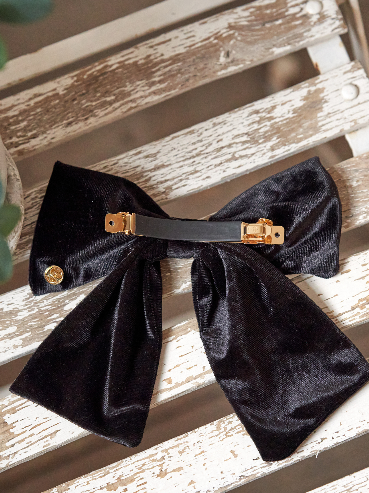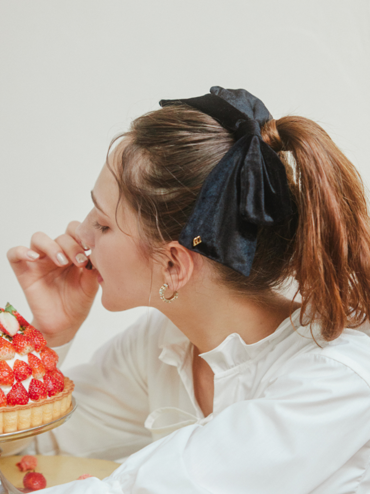 上品な光沢感が特徴のベロア生地のリボンバレッタ。サイズにこだわり大きめのリボンにすることで、華やかな印象を纏えるおすすめアイテム。リボン先にはさりげなくもポイントになるAnnMiruオリジナルチャーム付き。取り外しが可能なピンタイプなので、お洋服や雑貨など好きな所に付けて、お楽しみください♡