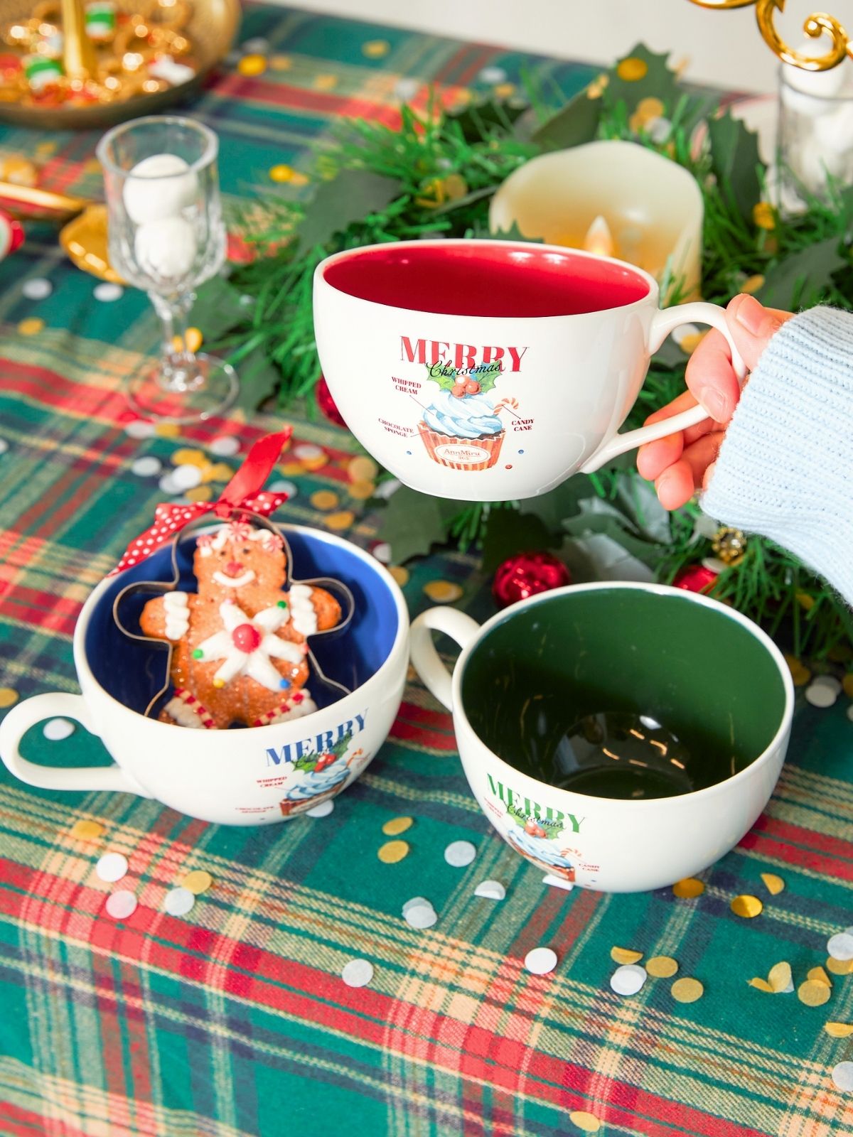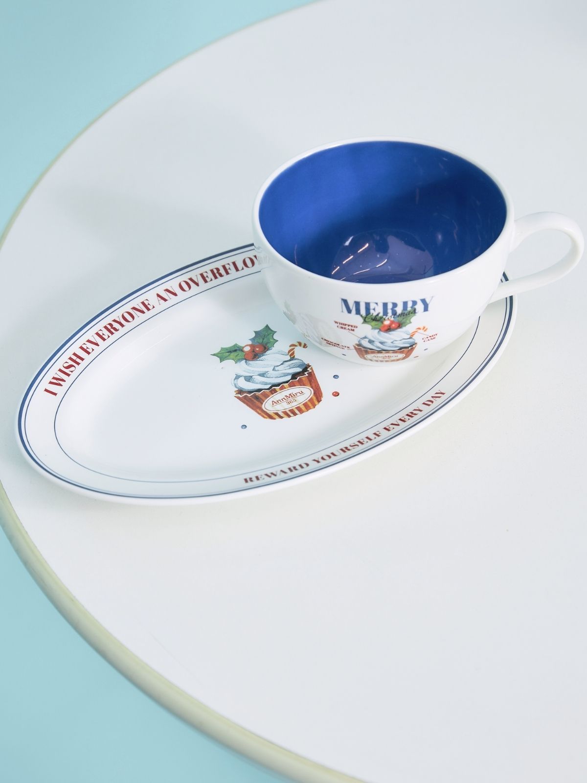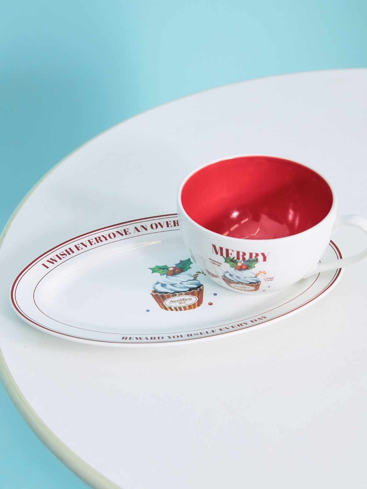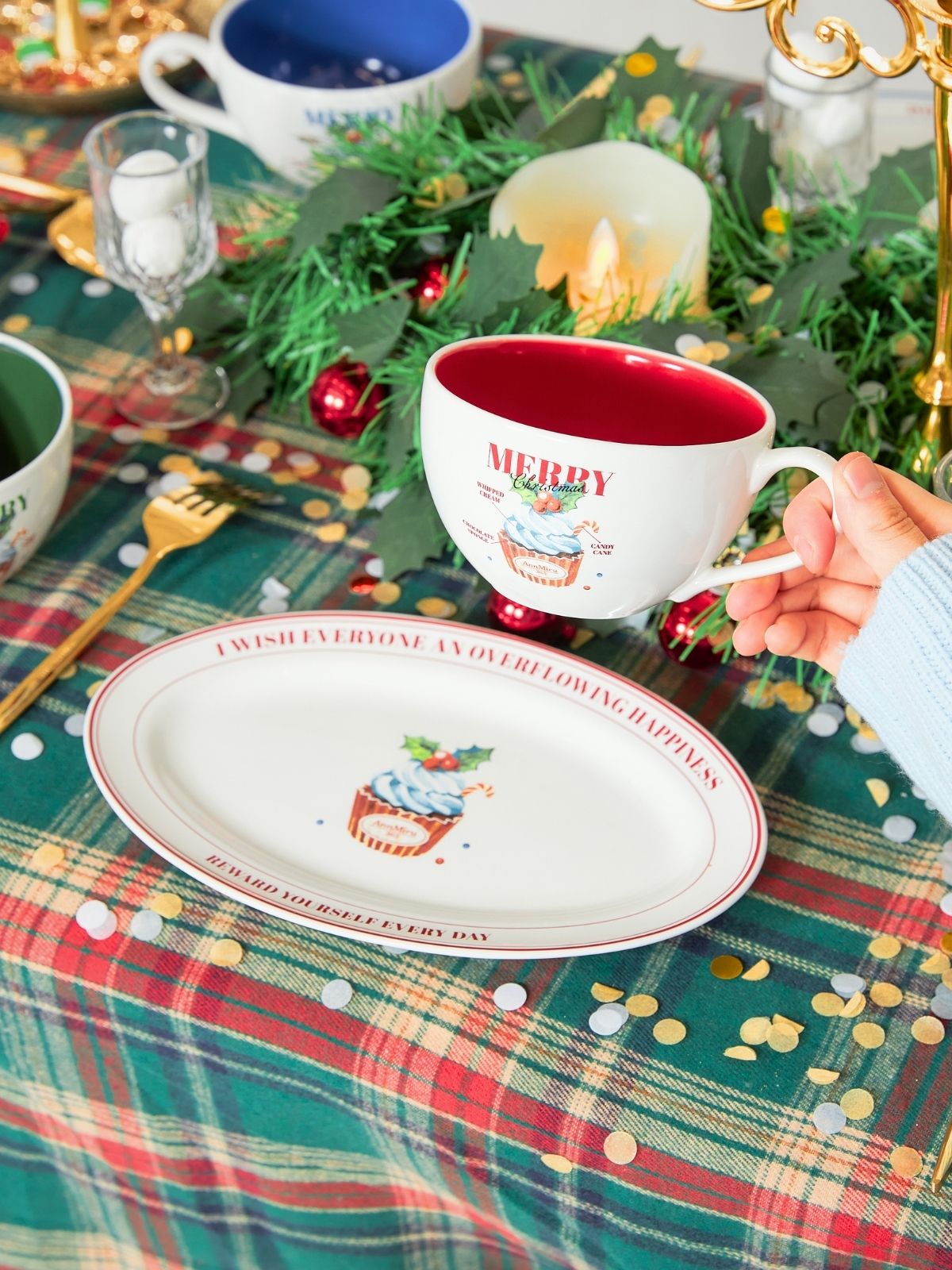 クリスマスカップケーキが描かれたマグカップ。